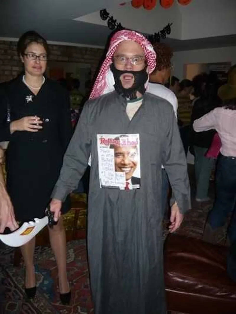 New York City, 2008 (that's my friend Robin as "Sarah Palin" next to me), and I'm dressed as ... what? An Islamic terrorist? Well, yes, but he's also an Obama supporter, as explained by the cover of "Rolling Jihad" taped to my chest. Instead of going with something timeless and elegant like "Jäger bomber" I've turned myself into a walking political cartoon (the ones that nobody gets). Do this, and you'll have people puzzling over your little commentary (or threatening to beat the s**t out of you on the F train) all night.