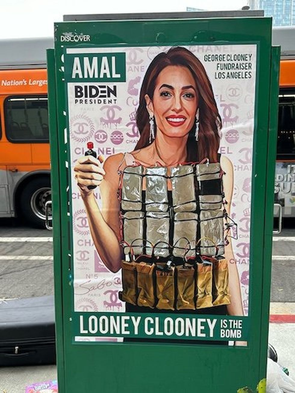 The products may have been fake, but the provocative posters served to call attention to a very real event: George Clooney's star-studded Biden fundraiser at downtown L.A.'s Peacock Theatre.