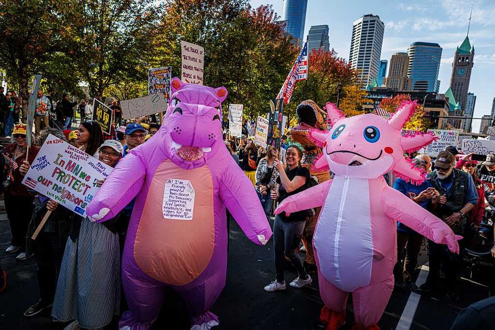 Many attendees dressed in inflatable costumes while others sported the red cloaks from "A Handmaid's Tale." A quick internet search bears witness to countless other dramatic protest garbs, from Stormtroopers to Uncle Sam to circus clowns. Those who didn't make a stop at a Spirit Halloween store before attending the protest wore their outrage on too-clever T-shirts or by swinging homemade signs.
