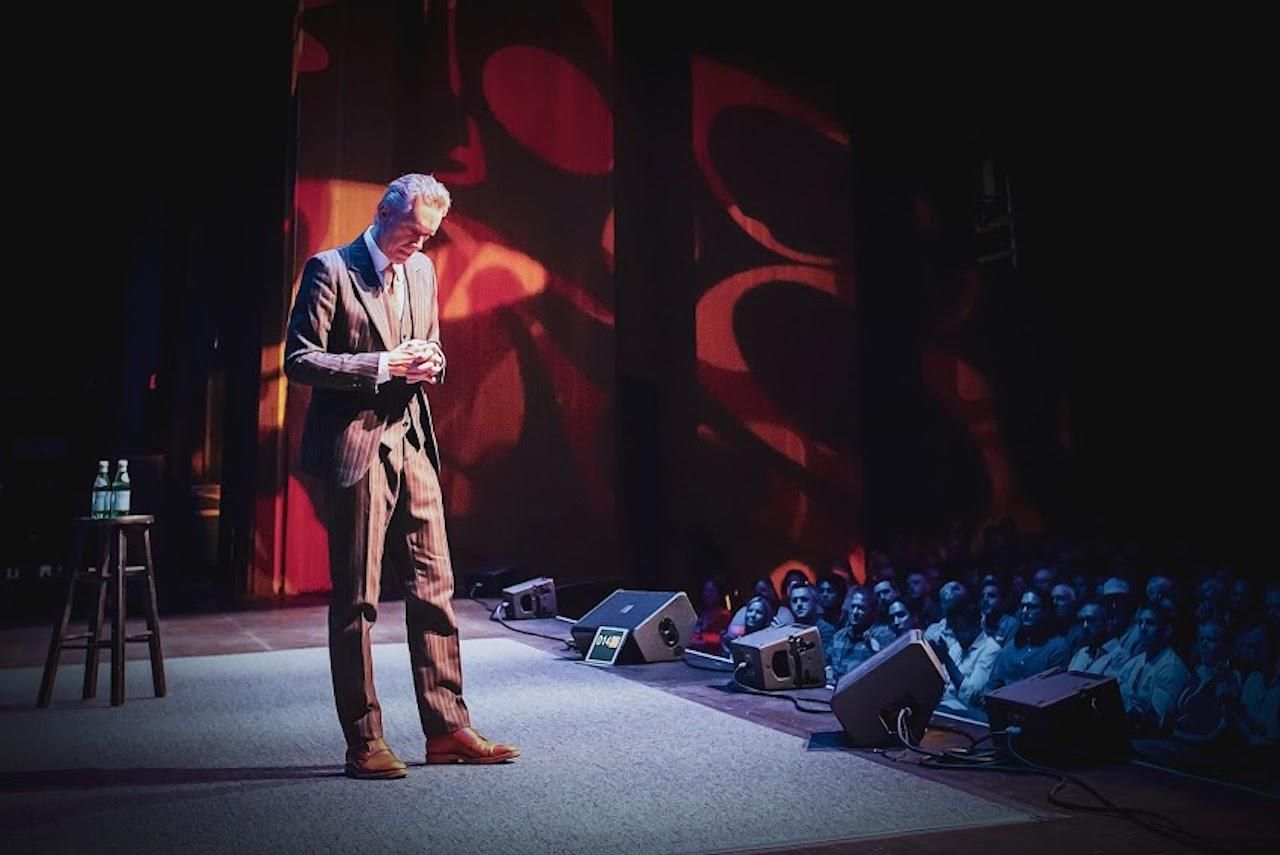 In a tufted chair, Peterson tells the audience that he was recently invited to write the preface for the 50th anniversary of Aleksandr Solzhenitsyn's "The Gulag Archipelago," a book that he references frequently and credits with effectively dismembering communism. It's the first time he's read the material to an audience and he'll spend most of the hour and a half show reading it. The entire room draws into silence as he weaves along the dark, obscure coils of the writing.