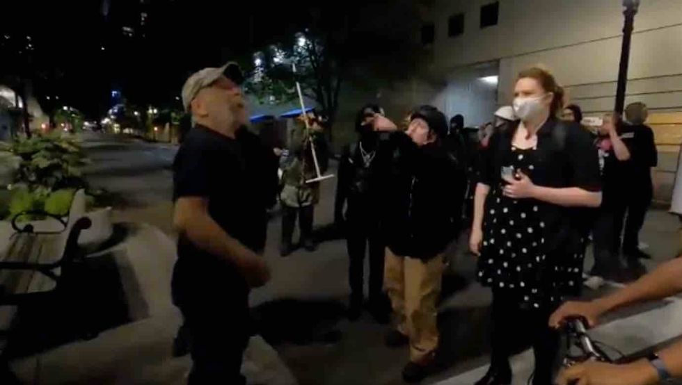 In a later clip, about 20 to 30 militants are seen letting the man leave but still following him down a sidewalk while yelling, "Get the f*** outta here!" The man is heard replying, "How am I a racist? I didn't say anything like that."