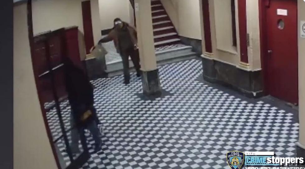 According to video provided by NYPD Crime Stoppers, a guy in a brown jacket and winter cap with UPS on the front knocked on the couple's door holding a box, clearly presenting himself as a deliveryman.