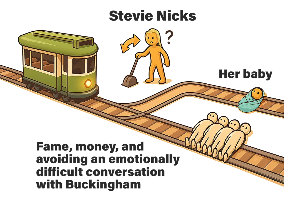 Philosophers use the “trolley problem” hypothetical to explore moral choices — sacrificing one life to save others from a runaway trolley. Nicks faced her own real-life version. One track held her child’s life; the other, her fame and comfort. She threw the switch. An innocent child died. Her fame soon followed.