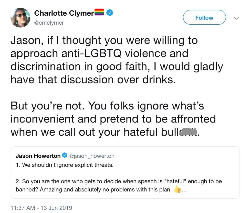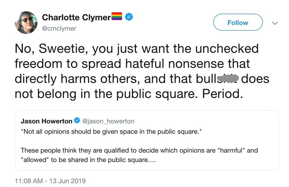 Plus, Clymer's follow-up tweets after being called out belie an agenda that goes well beyond vaccines, including tweeting that conservatives "just want the unchecked freedom to spread hateful nonsense that directly harms others, and that bulls**t does not belong in the public square. Period" and describing conservative views on gender issues to be "hateful bulls**t."