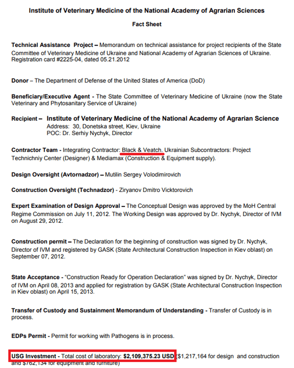 Indeed, in August 2018, Metabiota, which was created in 2008, announced it had been awarded a subcontract from Black & Veatch (B&V) to support the U.S. Defense Threat Reduction Agency’s (DTRA) Cooperative Biological Engagement Program (CBEP) in Iraq. Black and Veatch is the Kansas City-based engineering firm that is listed as the contractor on one of the DOD-funded veterinarian biolabs tasked with working on “pathogens,” among the documents recovered by NewsPunch from the U.S. embassy in Kiev.