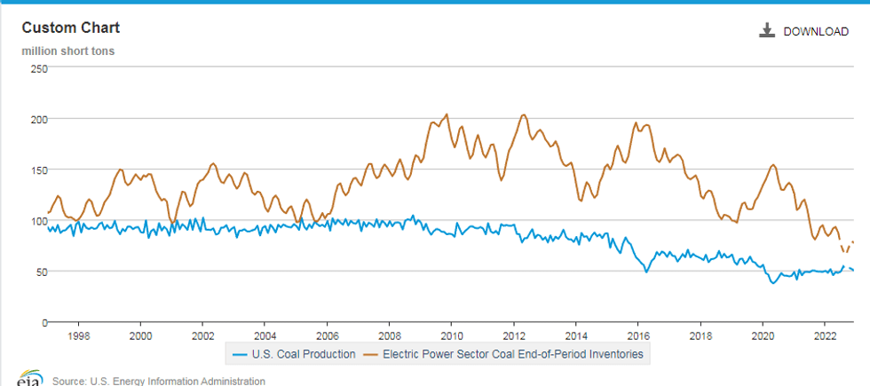 Our existing level of natural gas production would have been sufficient had our government not purposely set fire to our coal industry for a decade and then decided to engage in a thoughtless war with Russia without a contingency plan. In the U.S., coal once composed roughly half of our electricity source just 15 years ago, but has dropped precipitously because of destructive eco policies. Now it only accounts for 21% of our electricity source, so shocks to the system are going to harm American consumers. Yet thanks to the reduced inventories, we are struggling to even supply a smaller percentage of our grid with affordable rates. The price of thermal coal is now at an all-time high of $439 per metric ton.