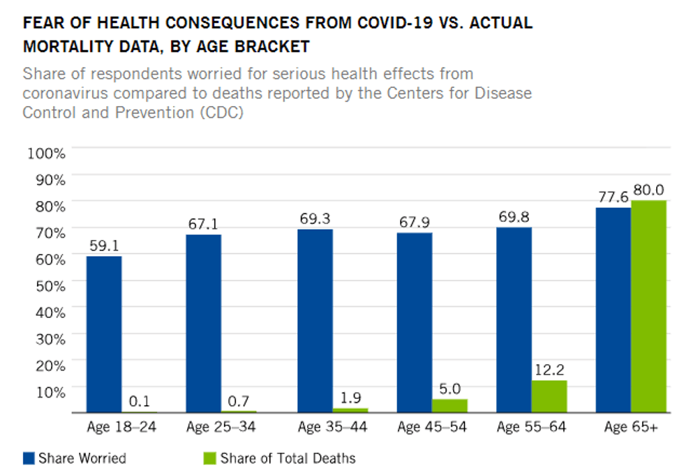 The psychological factors are starkly revealed in a recent survey from Franklin Templeton. Researchers observe, "Americans still misperceive the risks of death from COVID-19 for different age cohorts—to a shocking extent." They found from their survey that "Americans believe that people aged 44 and younger account for about 30% of total deaths; the actual figure is 2.7%" and that they overestimate the risk of death from COVID-19 for people aged 24 and younger by a factor of 50."