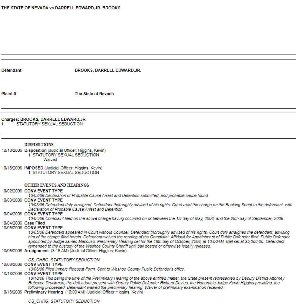 Heavy.com obtained his full rap sheet from Wisconsin court records and found charges of battery, gun misuse, strangulation and suffocation, and property destruction, dating as far back as back as 1999. Also, someone with his name and year of birth and with a picture that matches Brooks' description is registered as a Tier II sex offender on the sex offender registry in Nevada. There is a video online of Brooks discussing the incident in Nevada where he claims he didn't know the girl was 16 years old. On October 18, 2006, there was a deposition in Washoe County Court against a man with the same name for "statutory sexual seduction."