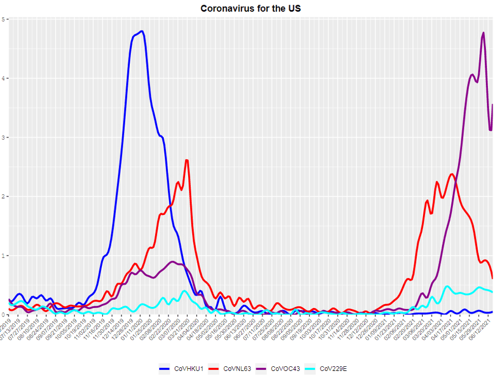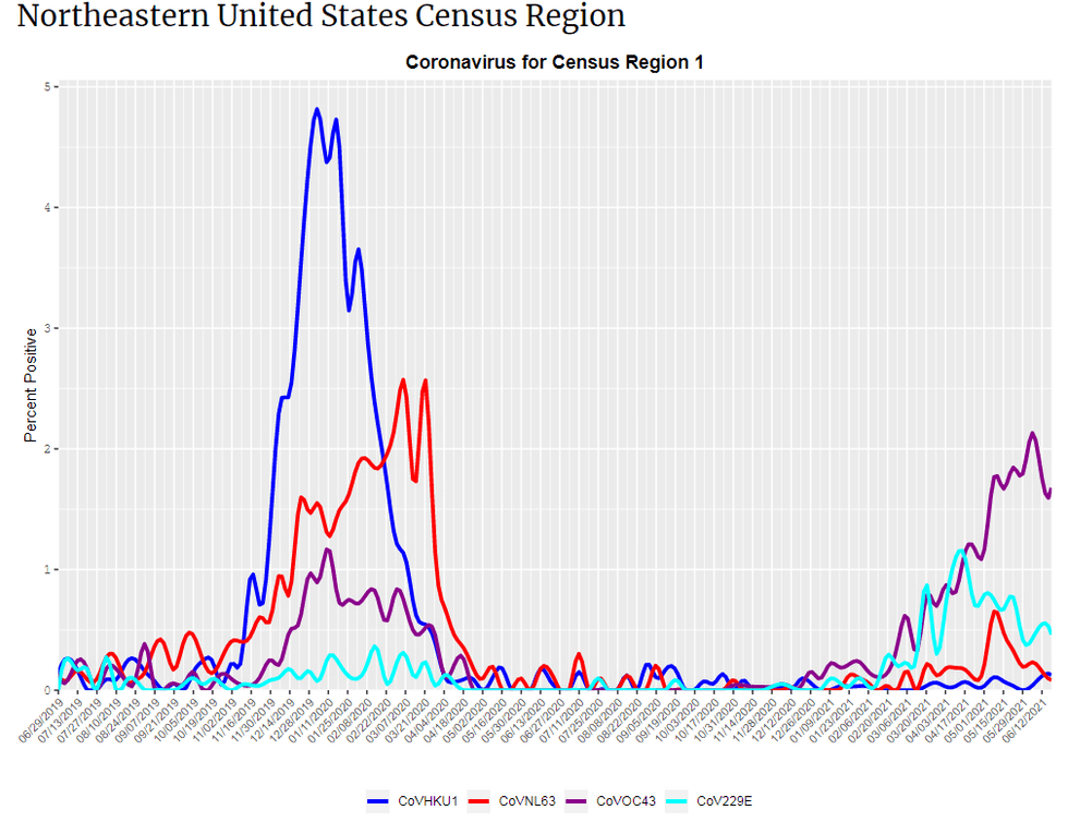 Similarly, the CDC's data for coronaviruses in the northeast (heavily masked) show those colds making a comeback long before the mask mandates were lifted.