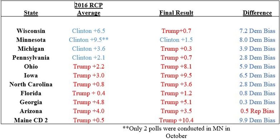 Here is a table of key states from 2016 comparing the final RCP polling averages to the final election results.
