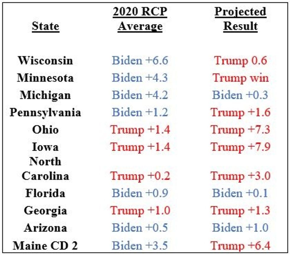 Now let's take the differential in the 2016 RCP average for each state and add the difference to the current RCP state averages for this election. These averages were posted as of 5:00 a.m. ET, November 3, 2020.
