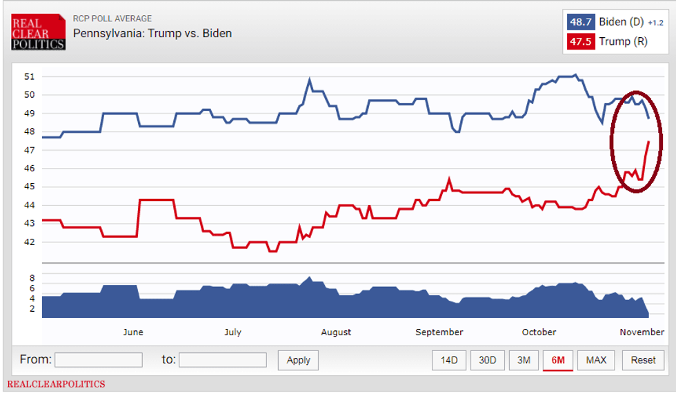 However, if Trump really were to win the Rust Belt and Midwest states again, it's hard to see him losing Arizona. Moreover, with the polling even more out of whack this year, the polling in Michigan could easily be off an additional 1-2 points, as we've seen the polls tend to be wildly off in the Midwest. Also, in 2016, Arizona was not polled nearly as much, because it was only viewed as marginally in reach for Democrats, so Trump actually underperformed his polling. It's reasonable to believe that if the other key swing states are off by that much, Arizona's polling would fall more in line with the polls we are seeing from states like North Carolina and Ohio.Finally, almost all of the polls show Trump closing strong in some of the critical states, such as Florida, North Carolina, Pennsylvania, Michigan, and Georgia. In the critical state of Pennsylvania, for example, the trend line for Trump is straight up, and unlike other battleground states, the Keystone State doesn't have early voting. Thus, Trump will capitalize on a larger pool of voters at his peak performance.