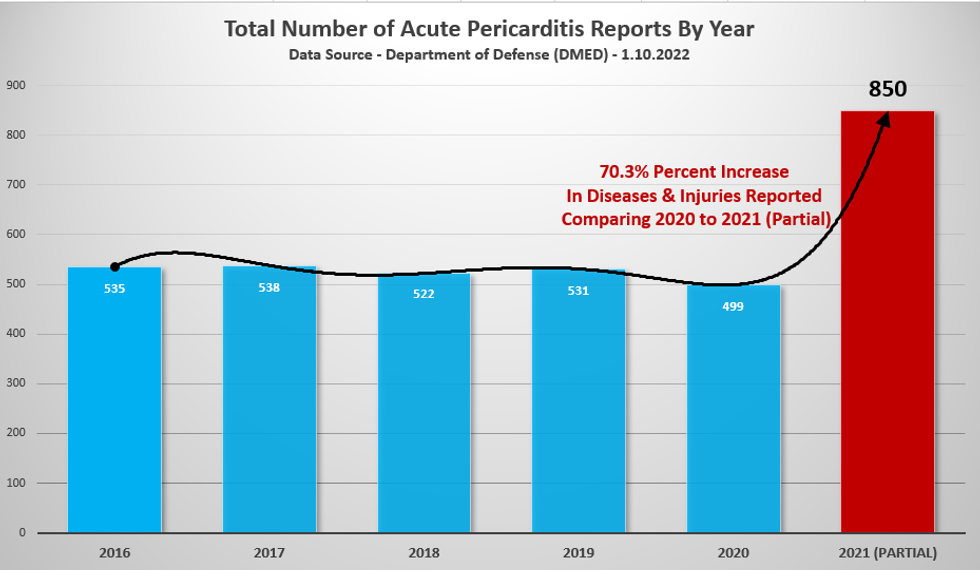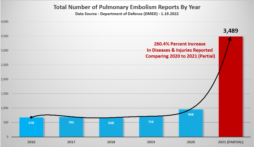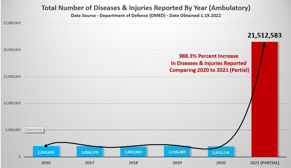 It’s now certain that the military’s health surveillance system — DMED — showed a massive increase in sickness and injury diagnoses in 2021 over previous years, particularly in the neurological, cardiovascular, oncological, and reproductive health categories. The military, in a very terse and cryptic statement to PolitiFact last week, admitted as much, but claimed without any further explanation that the data in the system accessed by several military doctors working with attorney Thomas Renz was only a “fraction” of the true numbers that existed. In the words of the Pentagon spokesman, it was a “glitch in the database.” Where those true numbers existed, why they weren’t in the system for five years, what exactly was in the system, and why the 2021 numbers were accurate according to the DOD account remain a mystery.