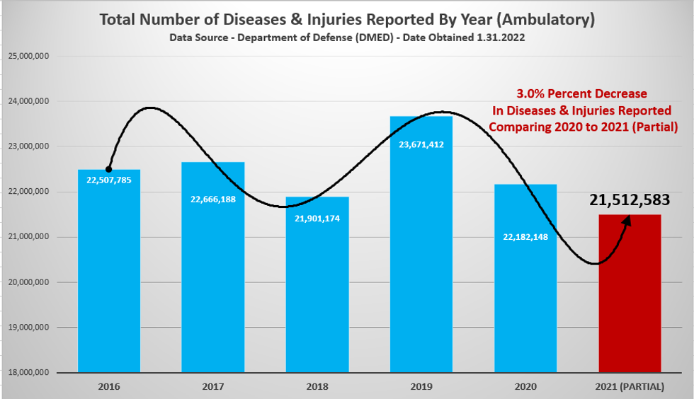 This is a bar graph presentation from Thomas Renz contrasting the 2016-2020 total outpatient ICD diagnosis codes in the military before the DOD change and after the change. As you can see, during a typical year, there were about 2 million diagnosis codes, jumping almost tenfold in 2021. However, based on the changes made last week, 2021 is exactly in line with every other year (even though 2021 remains slightly lower; the data does not include numbers from December).
