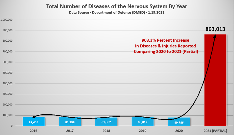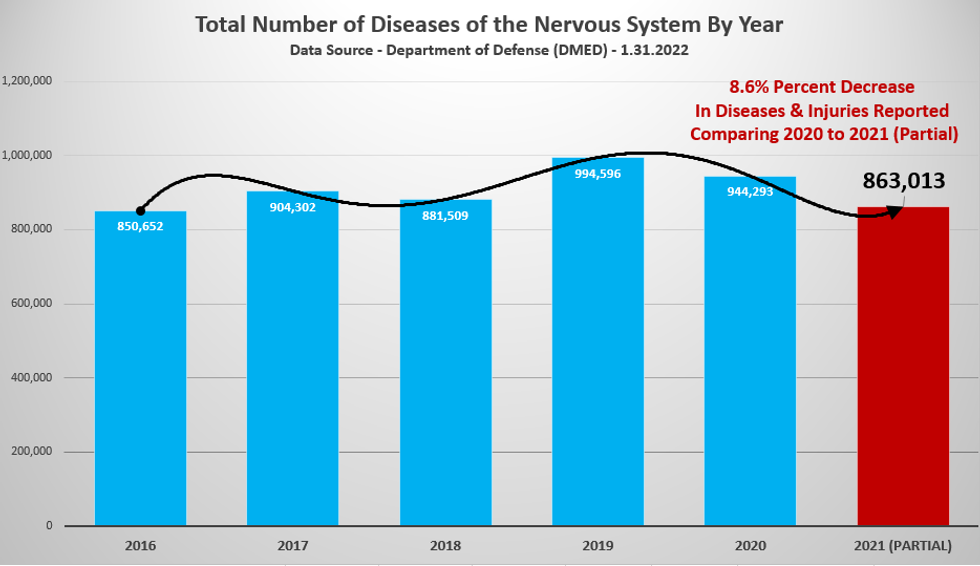 We are to believe that there was ZERO increase in the year of the Delta pandemic as well as what we already know from the civilian world about vertigo and migraines following the shots? We were all shocked by the percentage increase, but to say there was no increase whatsoever defies any expectation. Moreover, we are to believe that there are nearly 1 million nervous system diagnoses in the military every year in a fighting force of 1.4 million?