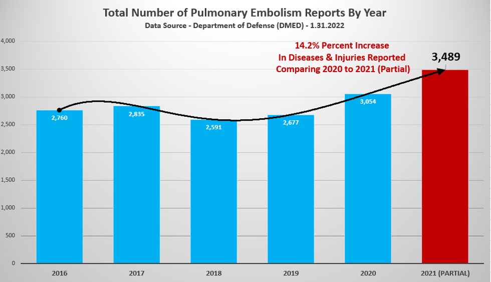 While even the “revised” numbers do show some degree of increase, it is not enough to account for the unprecedented nature of both COVID and the COVID vaccines. But the more serious issue is how can a military of healthy young people have such a high baseline of pulmonary embolisms every year? One estimate of pulmonary embolism prevalence in the U.S. is between 60 and 70 per 100,000 per year. But that is almost exclusively in the elderly and sicker population. Soldiers 20 to 25 years old don’t exactly get pulmonary embolisms. So even accounting for the fact that these are diagnosis codes and not unique individuals (some might have had a few visits in a year), the numbers are way too high.