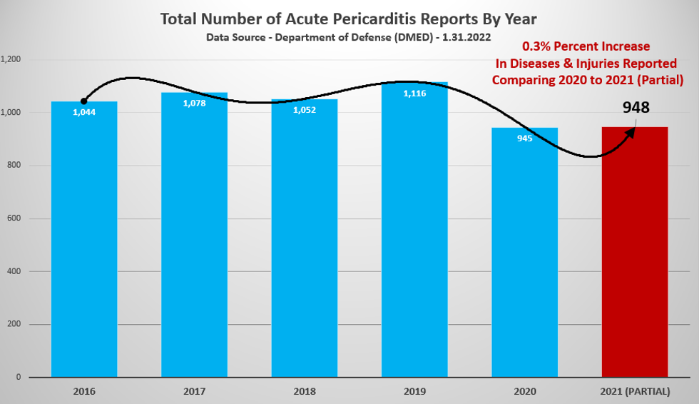Finally, it’s important to note that the DOD is so overprotective of the vaccine that it revised numbers to show zero increase in ailments that are universally understood to have increased – at least to some extent – because of the vaccine. Although they were smart enough to still show a baseline increase in myocarditis (everyone knows that), the new numbers would indicate zero increase for pericarditis.