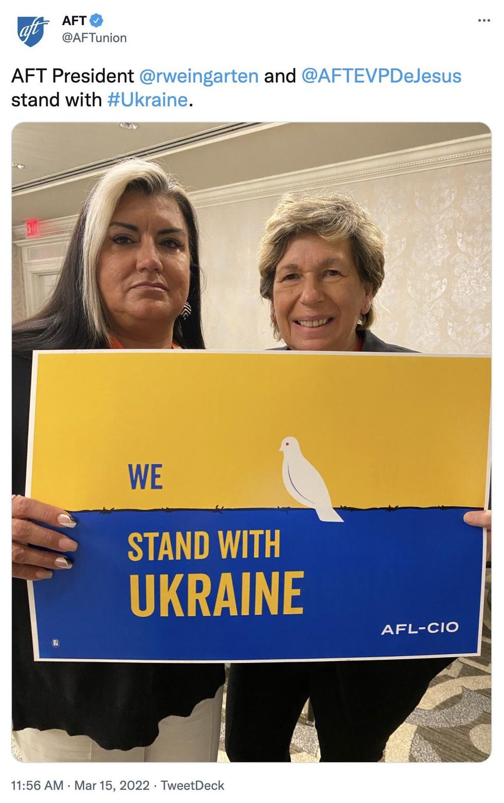 The union federation is so serious about backing Ukrainians being killed by Russian forces that they posed for a group photo Monday with their leadership raising their fists in solidarity and holding fancy signs the group had printed declaring, "We stand with Ukraine" — complete with a dove sitting on barbed wire and the Ukrainian flag as the background.