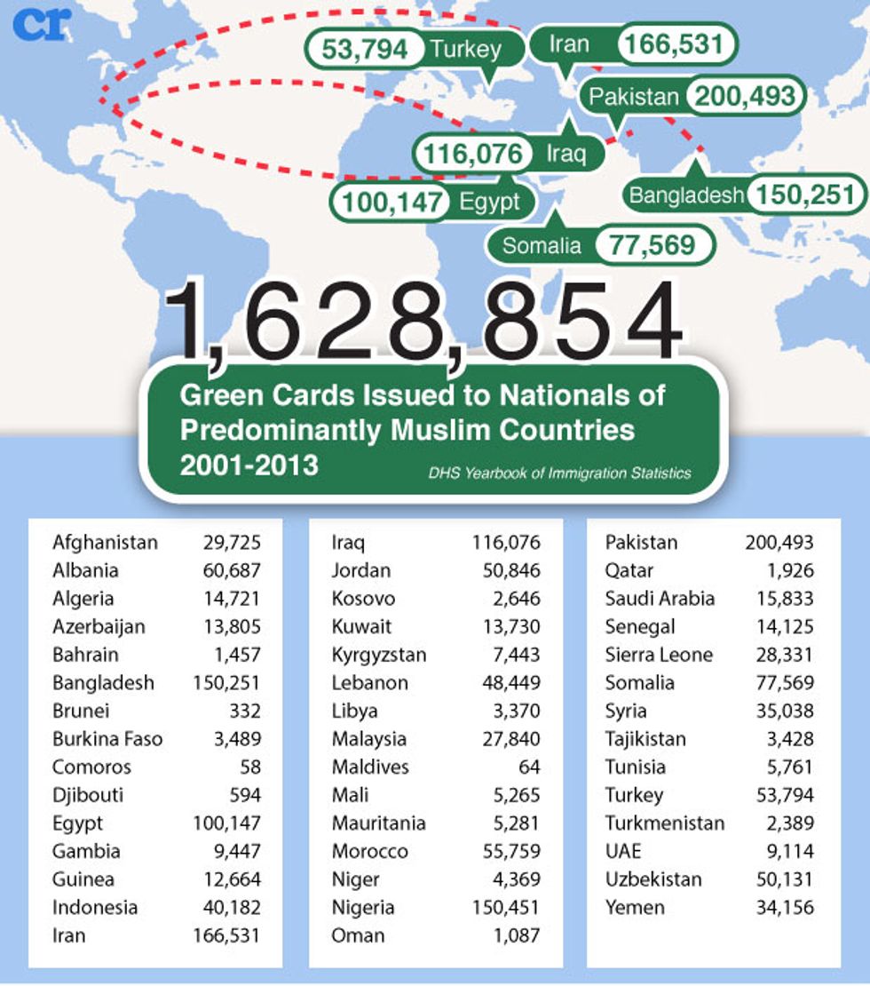 How many people in this country are aware of the fact that immigration from Islamic countries has doubled since 9/11? According to data Conservative Review collated from the DHS Yearbook of Immigration Statistics, the U.S. has issued 1,628,854 green cards to immigrants from predominantly Muslim countries from 2001-2013. Here is the breakdown by country: