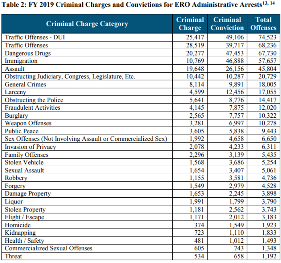 - This is just a tiny snapshot of the universe of criminality among illegal aliens and only includes the criminal offenses with more than 1,000 offenders. The fact that most of the crime numbers on the list are actually down roughly 10 percent from last year’s report, commensurate with the drop in total ICE apprehensions, demonstrates that ICE, even in a better year, is likely leaving a lot on the table. They caught fewer criminals this year because fewer agents were engaged in interior enforcement relative to FY 2018. Imagine how many they’d catch if they had 10,000 deportation officers rather than 5,000.