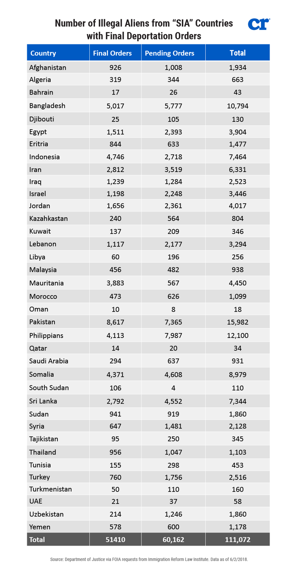 It is mind-boggling to think that 51,000 illegal aliens from these countries could still remain here despite final deportation orders. Another 60,000 are still working their final appeal. Remember, we have had enough security issues with some legal immigrants from these countries who are better vetted. Can you imagine how little we know about these illegal aliens who remain in our country?