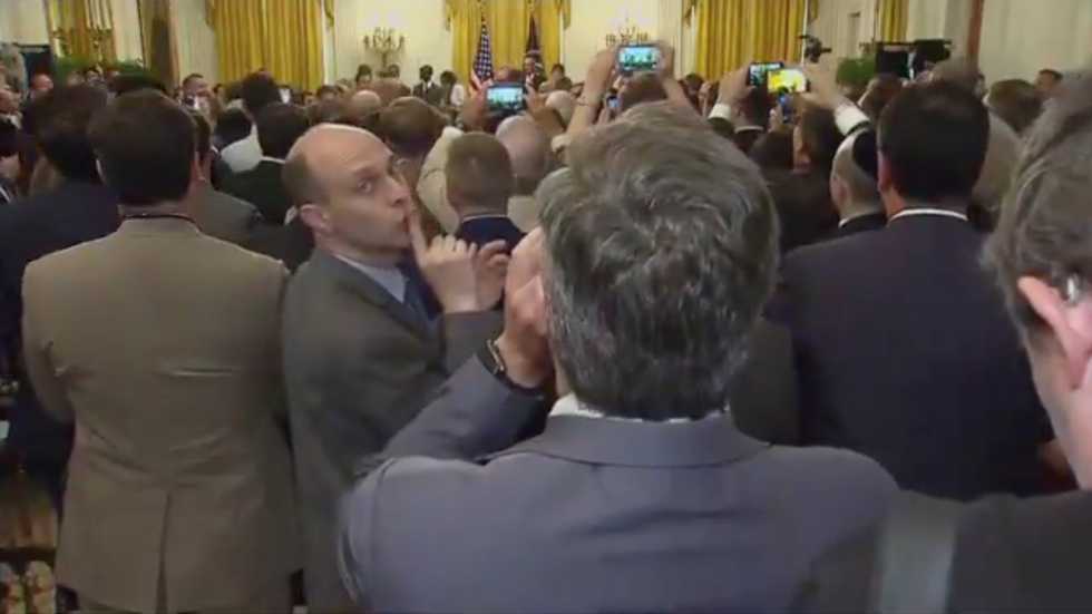 After Trump spoke, the CNN reporter yelled at the president, “Will you stop calling the press the enemy of the people, sir?” while other guests stood respectfully and clapped. One shushed Acosta.