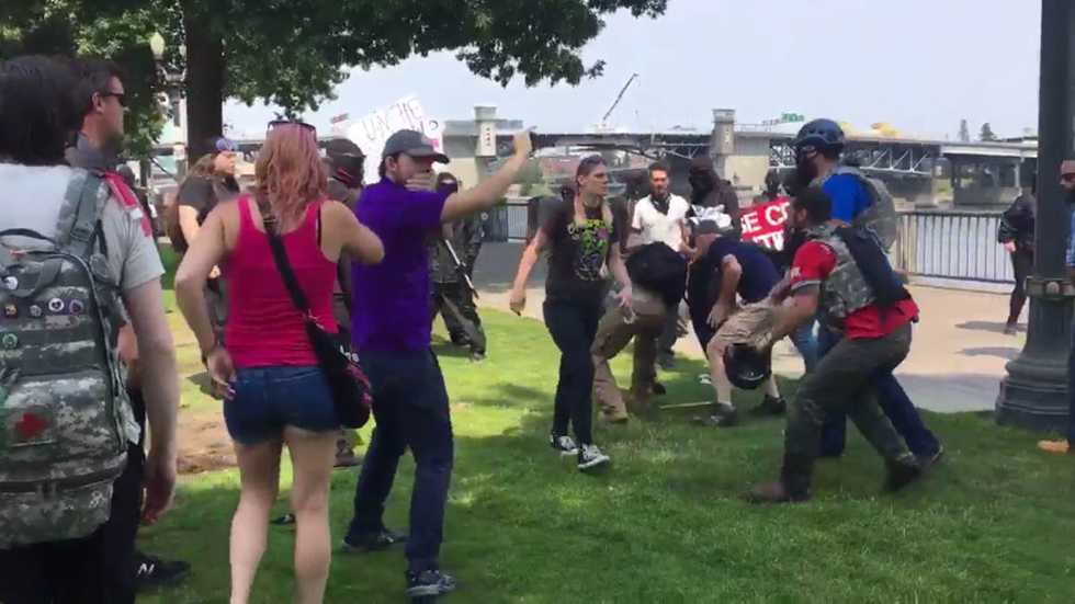 The event took place Sunday afternoon in Tom McCall Park in downtown Portland, Ore. A group called “Patriot Prayer,” led by video blogger Joey Gibson, held the event. The media characterizes Gibson's group as Alt-Right, but he prefers to describe himself as pro-Trump and libertarian. The rally was to promote “freedom and tolerance for people who think differently.” They were met by leftists in black bloc garb, chanting “No Trump, no KKK, no fascist USA.” Then civilization broke down.