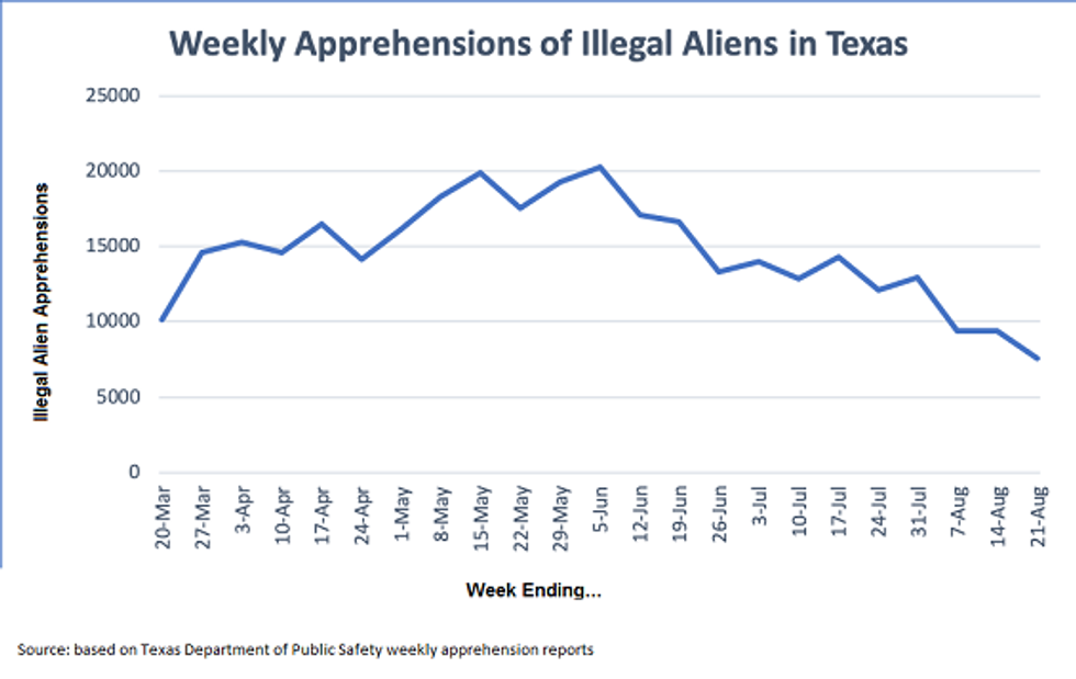 Nine days ago, I reported, based on exclusive data measuring apprehensions in the state of Texas, that weekly apprehensions in the Lone Star State had dropped 54 percent from the peak of May through the first week of August. Well, now I have obtained data from the next two weeks in August, ending on the 21st of the month, and the numbers have dropped another 19 percent statewide. During the reporting week ending Wednesday, August 21, there were 7,605 illegal aliens apprehended in Texas, for a total drop of 62 percent from the worst week at the end of May and early June.