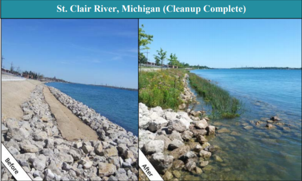 In FY 2016, federal agencies and their partners finished the management actions needed to delist the St. Clair River AOC in Michigan. One of the habitat projects at St. Clair River, Marysville Living Shoreline, is shown here.