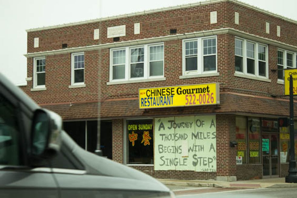 The local Chinese restaurant, like many business has positive graffiti on the building.