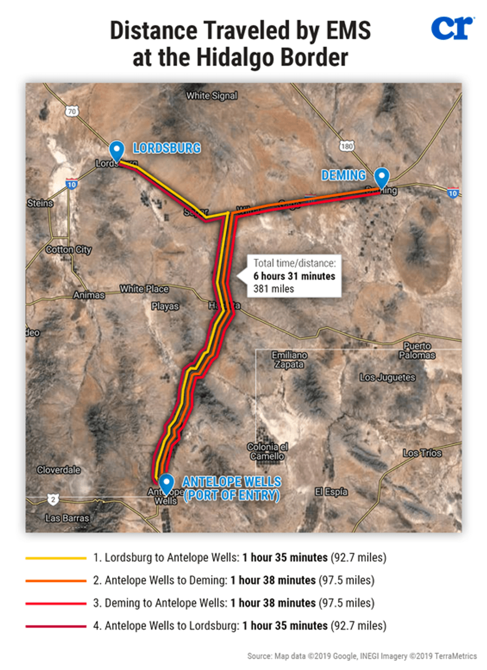I spoke with David Whipple, the head of the seven-man EMS team in Lordsburg, the Hidalgo County seat, and he told me that while CBP has stepped up in recent weeks to provide its own EMTs, his tiny ambulance service has had to drive all the way down to the border, pick up sick migrants together with at least two border agents at a time, and drive them to the hospital in Deming and then back again.