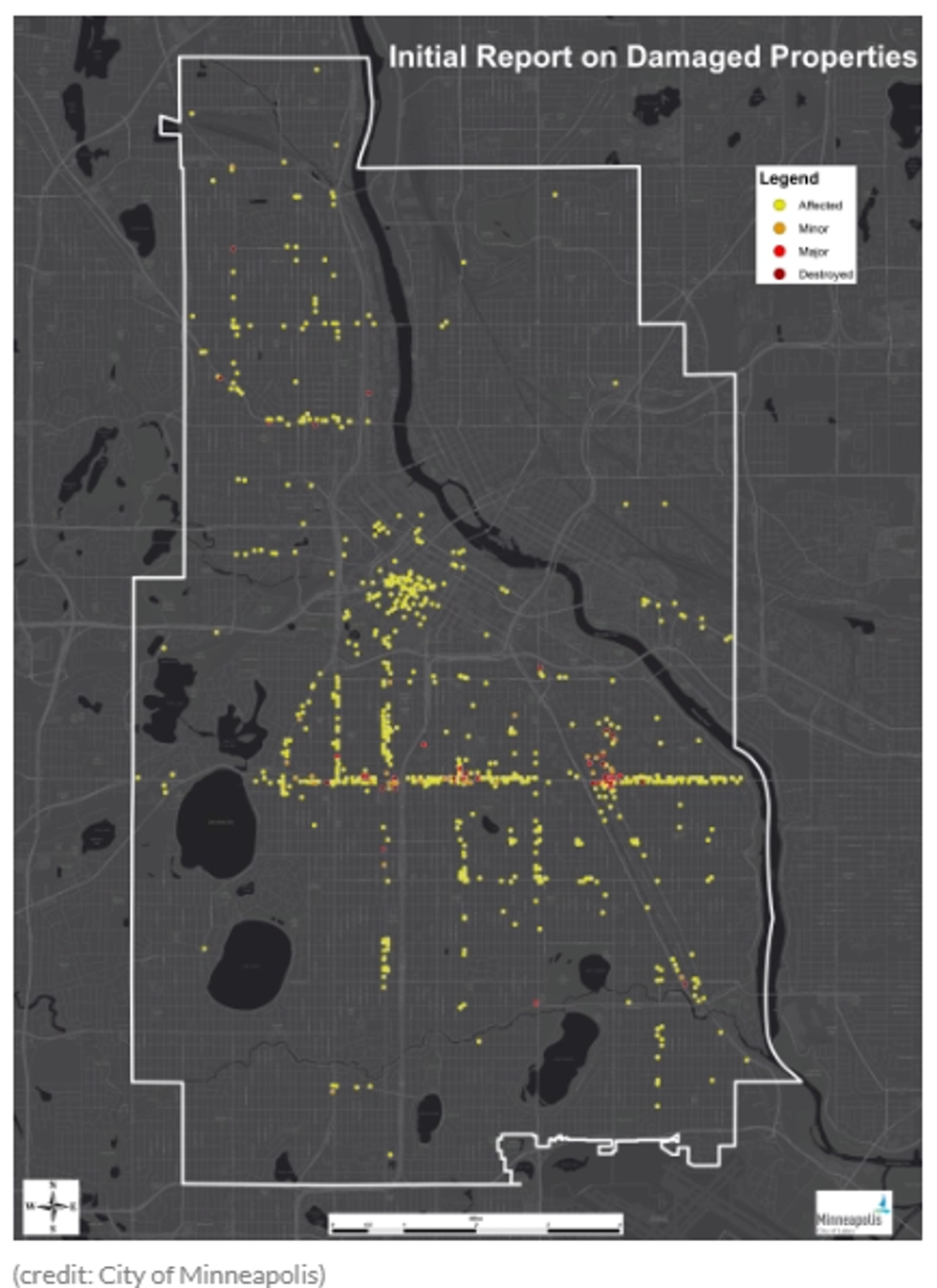 Lost in the rose-colored reporting on the modern-day pilgrims and pioneers taking to the streets, Minneapolis officials posted a map of 700 buildings that have been partially or fully destroyed throughout the city, many of them housing multiple businesses. Overall, across the broader Twin Cities area, more than 1,500 buildings have been vandalized or looted or had doors and windows smashed.