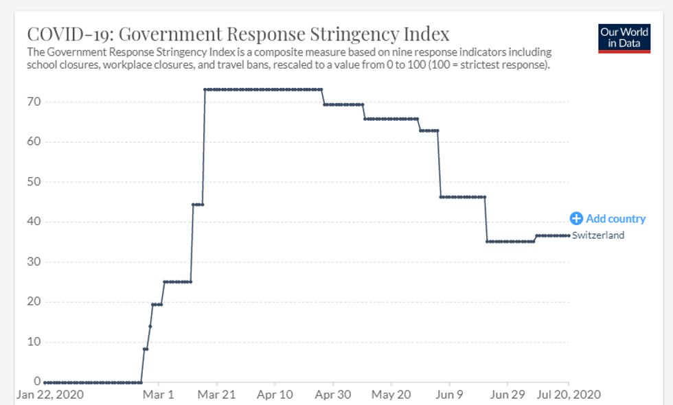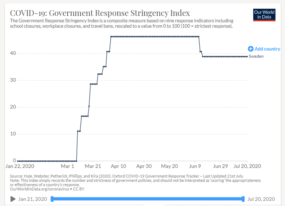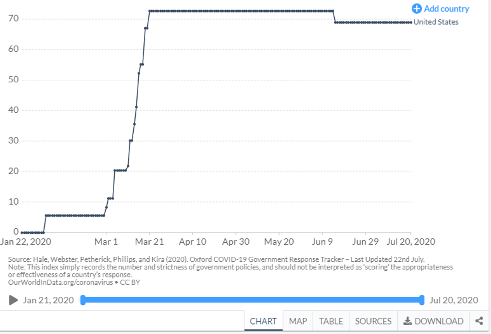 Using a scale of 1-100, Oxford researchers gave one point to each country for a list of 17 policies that they implemented during the epidemic and tracked that aggregate score over time.