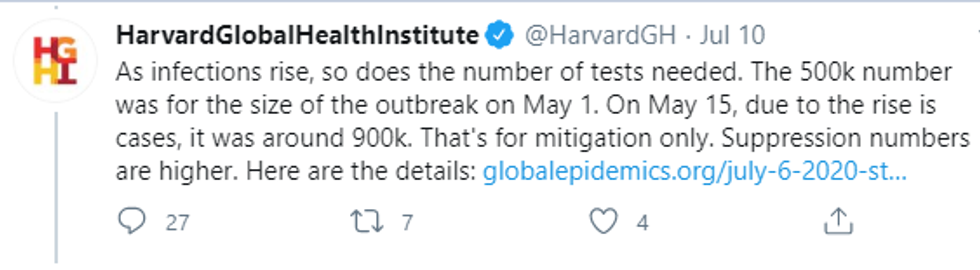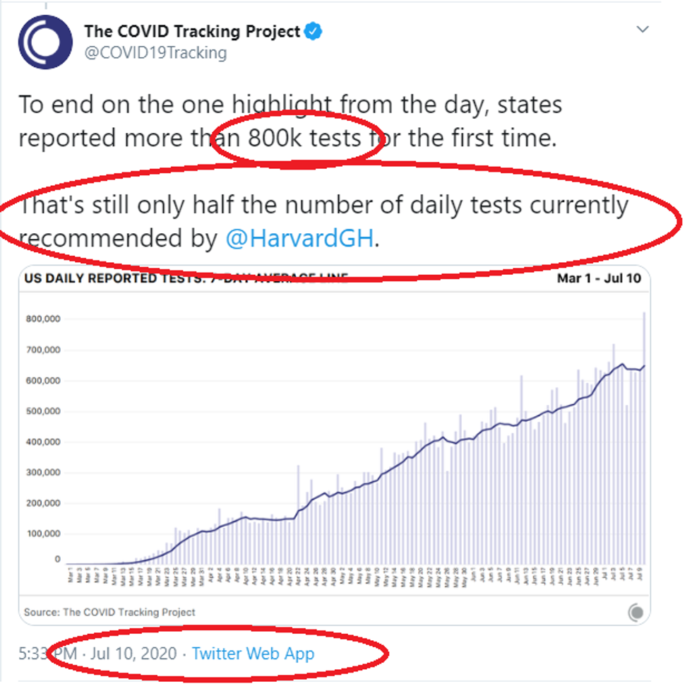 On July 11, Covid Tracking tweeted its daily testing chart and noted that Harvard Global Health’s recommended daily testing was now 1.6 million per day.