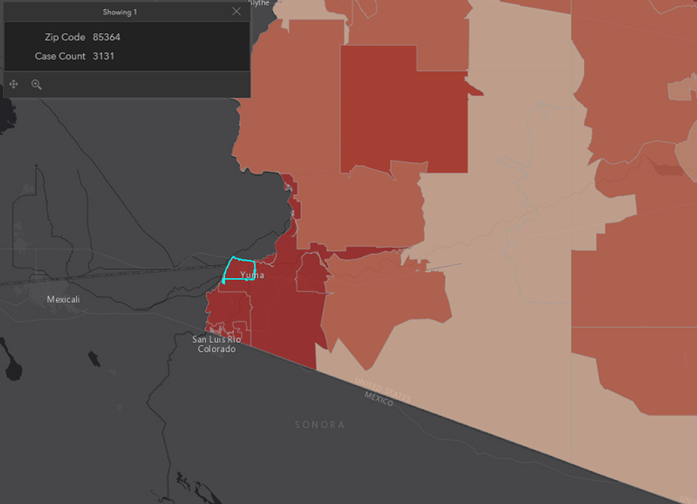 It’s the zip code with the most COVID-19 cases in the state of Arizona. It’s not in the population center of Phoenix, but in Yuma, right at the Mexican border. It is also the home of Yuma Regional Medical Center, which has likely received cases from across the border. As the New York Times reported in June, “Border towns in Arizona are experiencing an increase in infections that health officials believe is tied to people coming in from Sonora state.”