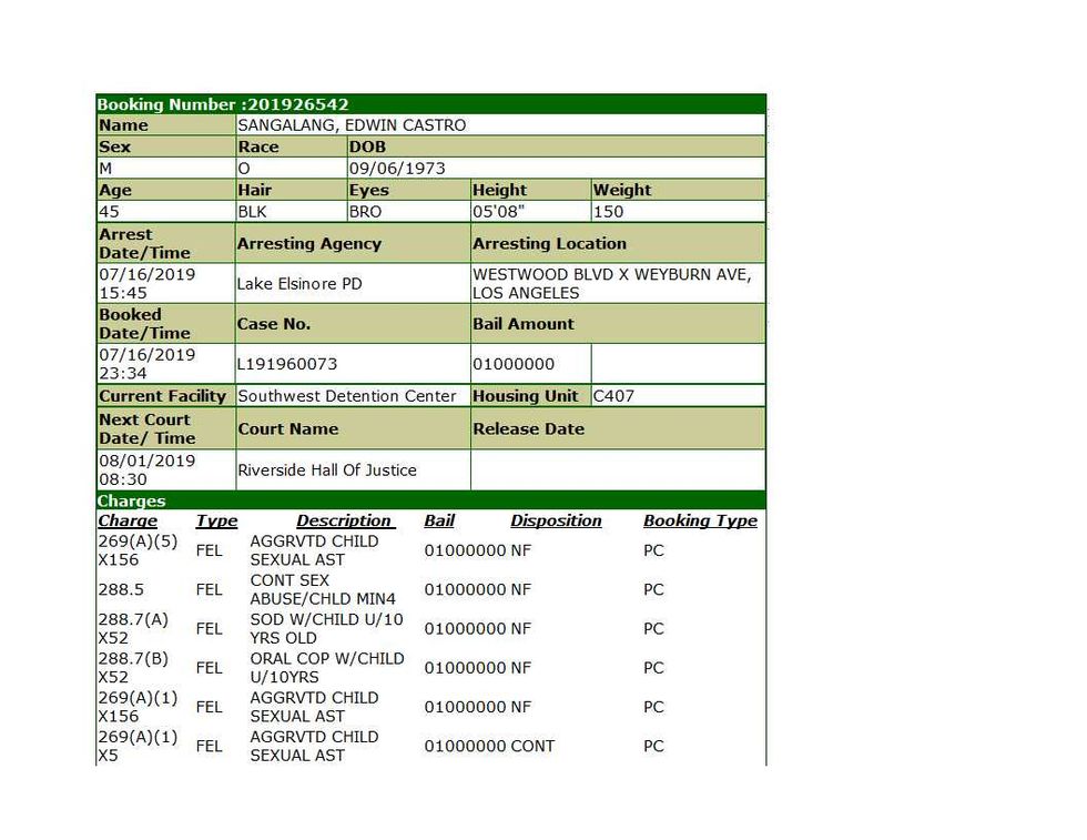 Jail records from Southwest Detention Center in Riverside County indicate that Sangalang was booked on a total of 437 felony charges, including 156 counts of aggravated child sexual assault, 52 counts of oral copulation with a minor, five counts of sexual penetration by force or fear, and one count of continual sexual abuse of a child.