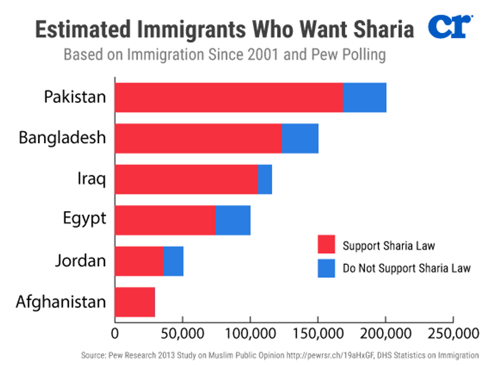 There is a lot of discussion about the lack of vetting that Tafsheen Malik underwent when applying for an immigrant visa from Pakistan. DHS prohibited their agents from searching her social media records. But the broader problem is even if we did “vet” their views, what do you think we would find? A love for America, Jewish people, and democratic values? Undoubtedly, there are some individuals yearning to escape the Middle East mentality. But take a look at the percentage of those from selected Muslim countries who dislike Jews and/or Support Sharia law.