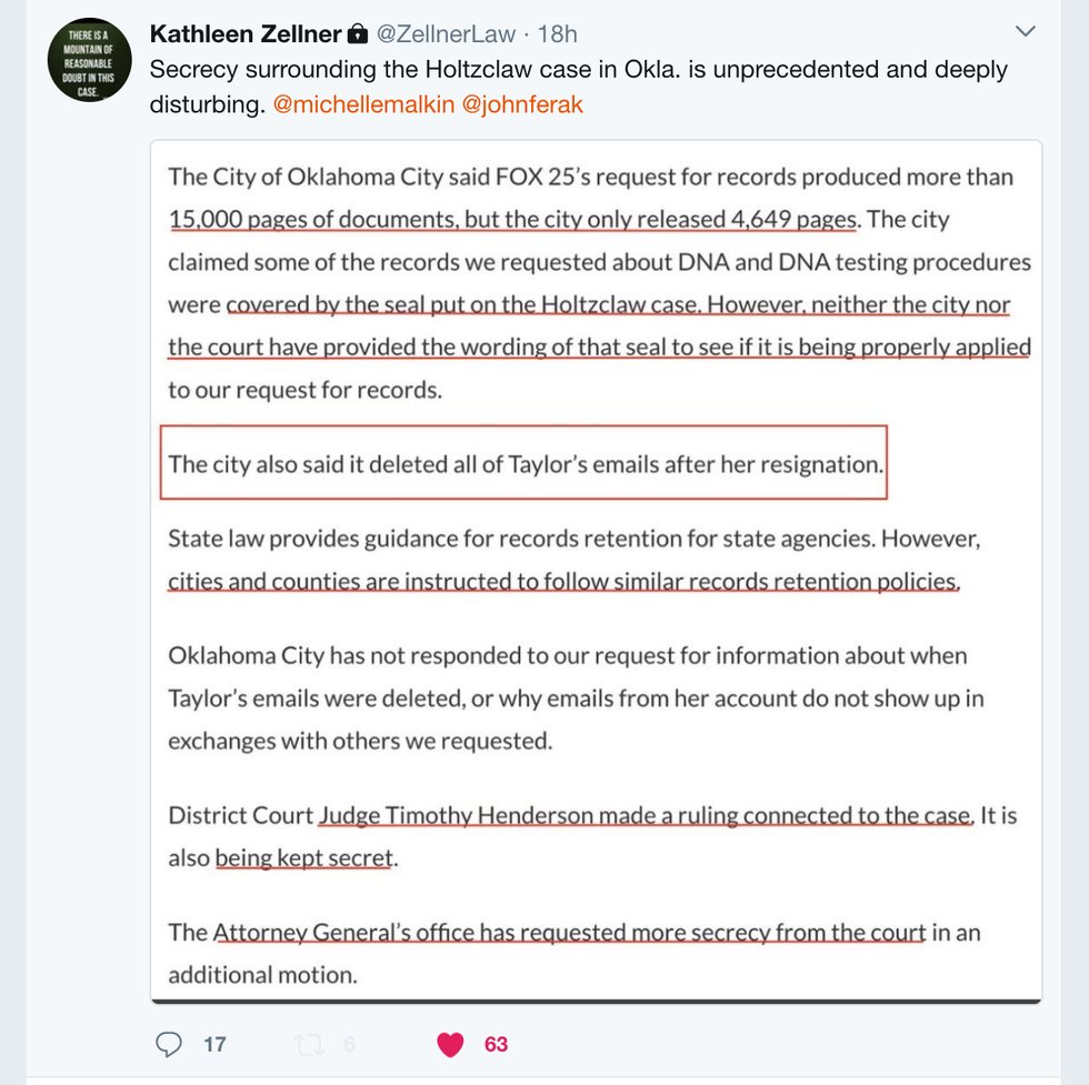Holtzclaw's lawyers and Holtzclaw himself have been left completely in the dark to this day about all of these filings and hearings. Brian Bates, the vigilant private investigator who served on Daniel’s original defense team, is keeping a close eye on the secret proceedings and maintains updates here. After Bates visited the court clerk’s office and asked why the OCCA was not following its own rules regarding disclosure of protective orders, a local reporter did the same and was told by a court employee: