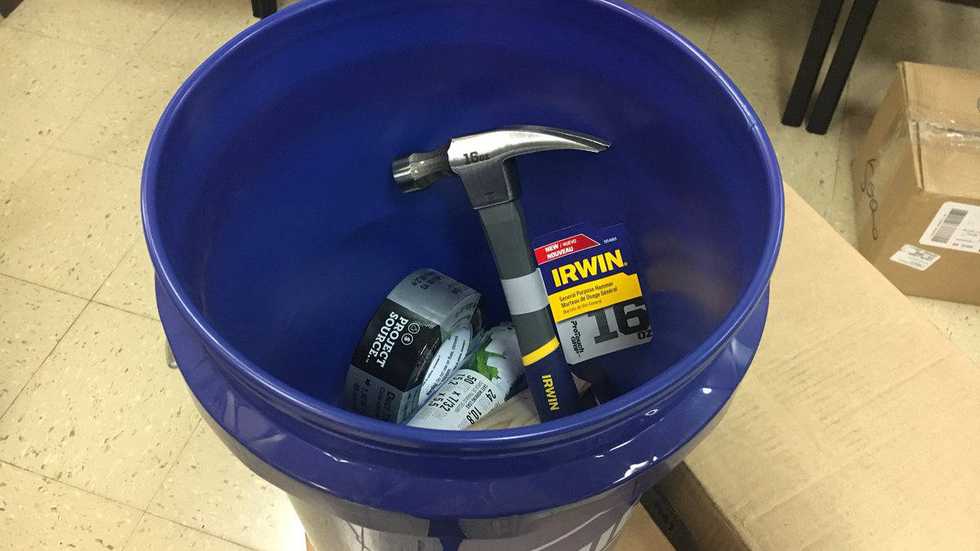 Senior WCVB reporter Jorge Quiroga tweeted an image of one of the buckets, which contains a hammer, a wooden doorstop block, duct tape, and rope to be used in case of an emergency school lockdown or shooter situation. Lowe's is providing the materials to the school district wholesale, at about $11 per bucket.