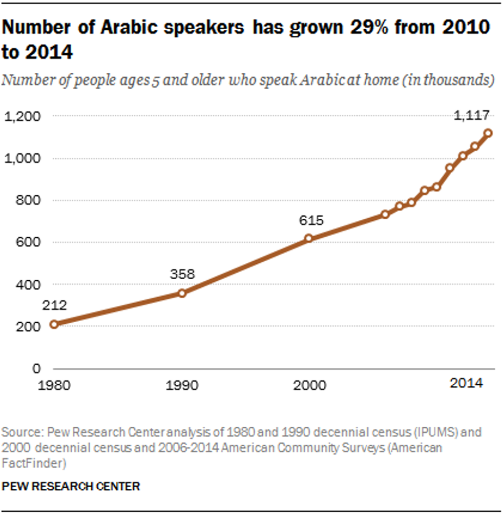 According to Pew Research, Arabic is now the fastest growing language in the U.S. and the Census Department will offer Arabic translations of the decennial questionnaire for the first time in 2020. The number of people speaking Arabic has grown by 29 percent from 2010-2014, whereas the number of Spanish speakers has only grown by six percent over the same period. The most up-to-date monthly data from the Current Population Survey clearly indicates that this trend has grown in 2015 and for the first quarter of 2016.