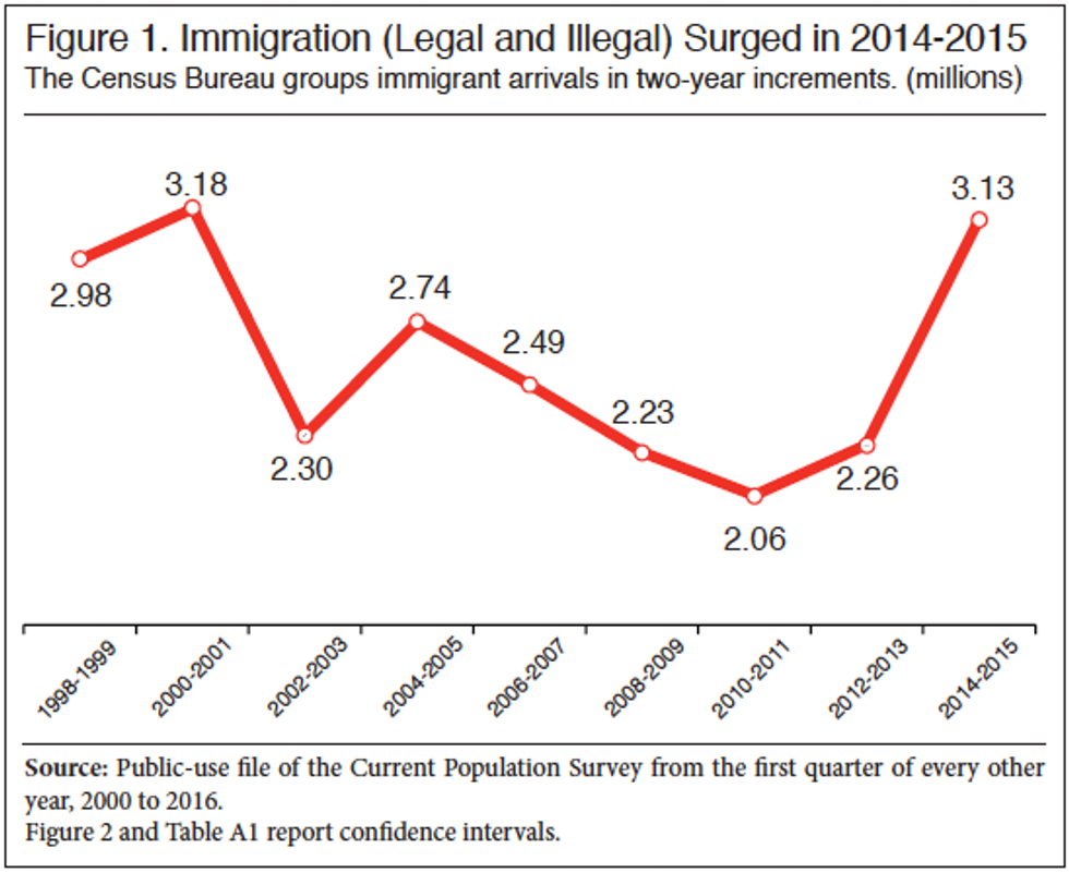 A detailed analysis from Steve Camarota of the Center for Immigration Studies reveals that 3.1 million immigrants arrived in the United States over the two-year period since 2014, the sharpest increase since 2000. While the annual issuance of green cards has been hovering around 1 million per year, the most up-to-date monthly data from the Census’s Current Population Survey shows that when combined with long-term visas, the growth in immigration as a whole is demonstrably more, given that the immigration population has grown by 1.6 million from 2014-2015.