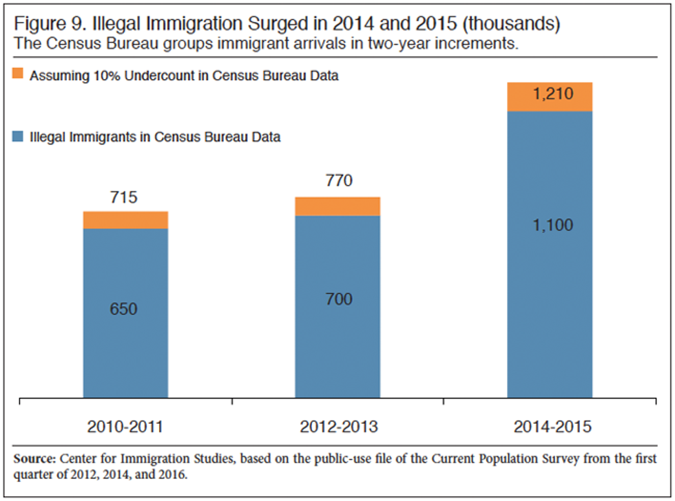 Also, the Census has tended to undercount immigrants, especially illegal immigrants. Factoring in the undercount, Camarota demonstrates how, contrary to the position of some academics, the illegal immigrant population is clearly on the rise. He calculates that there has been a 69% increase in the flow of illegal immigrants from the two-year interval of 2010-2011 to 2014-2015, when factoring the likely undercount in the Census data.