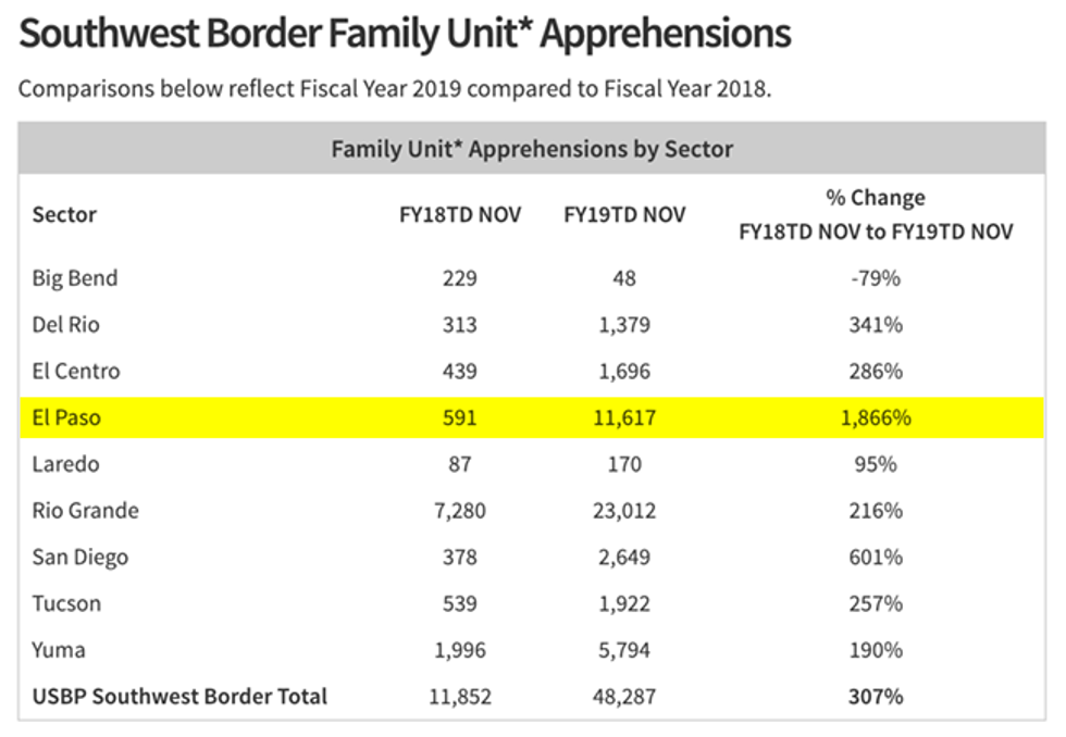 As you can see, although the surge of family units has exploded in almost every sector of the border for the first few months of fiscal year 2019, nowhere is this surge more evident than in the El Paso sector, which lies along the borders of both Texas and New Mexico. What has been a relatively dormant sector for many years is now the second largest alien-smuggling corridor behind the Rio Grande Valley, even surpassing San Diego, Tucson, and Yuma. This sector also experienced the sharpest increase in unaccompanied teens, five times greater than the increase in San Diego. That number is beyond staggering, and more than any other data point, it encapsulates the unprecedented degree of emergency at our border. There are many lessons from what we are seeing in this sector.