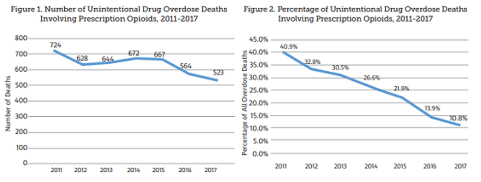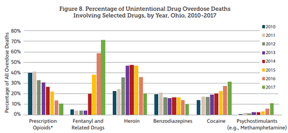 In 2017, 4,854 died in the Buckeye State from unintentional drug overdoses, more than any other year on record. Of those deaths, just 10.8 percent were from prescription drugs, according to the Ohio Department of Health. And there’s good reason to believe that some of those deaths are really the result of heroin too. According to the Centers for Disease Control (CDC), many of the deaths due to morphine are likely really heroin deaths but recorded as morphine in toxicology “because morphine is a metabolite of heroin.”
