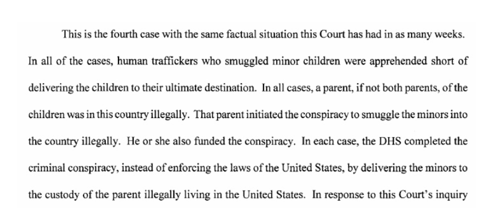 In 2013, Judge Andrew Hanen of the Southern District of Texas accused Obama’s DHS of “successfully complet[ing]” the “goal of the conspiracy” of drug smugglers to smuggle people over the border on behalf of parents “at significant expense” to taxpayers. What the Trump administration continues to do because one district judge said so, Hanen actually said is illegal. A private citizen would be prosecuted for delivering teens smuggled in to illegal alien family members: