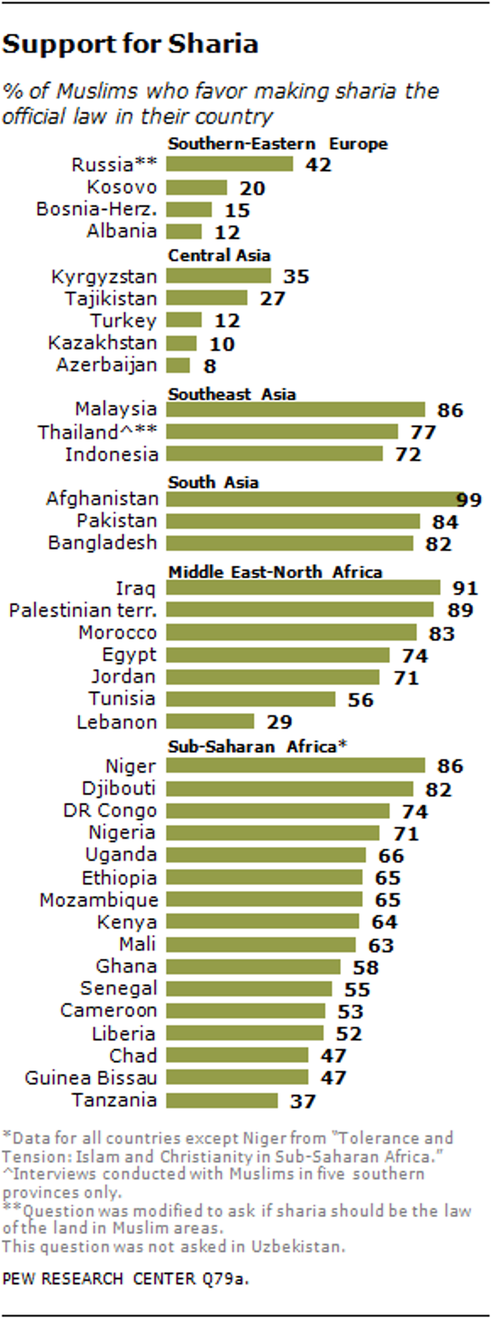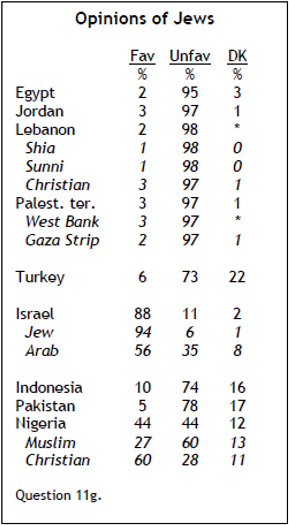 The contrast between Muslims and Christians in the Middle East is also borne out by data collected by Pew a few years ago. Take a look at the percentage of those from selected Muslim countries who dislike Jews and/or support Sharia law.