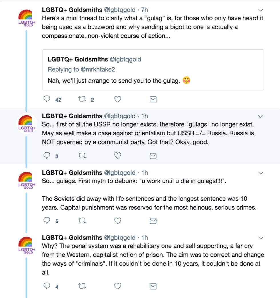 LGBTQ+ Goldsmiths, a student group at Goldsmiths, University of London, defended Soviet Union-style gulags as a "compassionate, non-violent course of action" to deal with "anti trans bigots" in 2018.