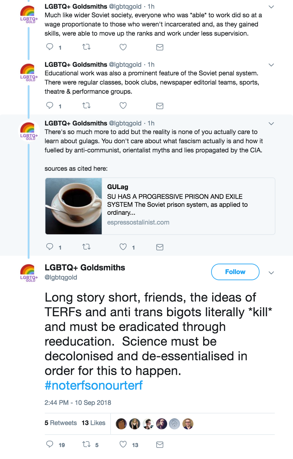 In a tweet thread presented here, LGBTQ+ Goldsmiths explained that the forced labor camps established under communist dictator Joseph Stalin were not really that bad and have modern applications for individuals who oppose transgender ideology.