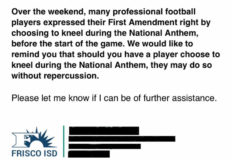 In an email directive, Frisco Independent School District coaches have been told not to stop any students from kneeling. If students choose to kneel before the game, “they may do so without repercussion,” states a copy of the note provided to CR by a member of the Frisco ISD community.