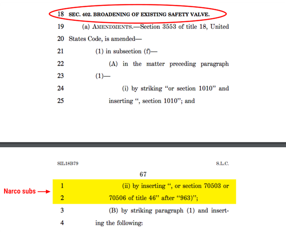 Do you know what those highlighted subsections are? These are the pilots and crews of maritime drug boats, including “narco-subs,” who will now be able to avoid the mandatory minimums. These are the people who drive the submarines or other vessels for the Columbian cartels, such as FARC, that are hooked in with Hezbollah to peddle tons of cocaine into this country, killing thousands of people at record levels, particularly African-Americans. Yes, these cartels are so wealthy that they have a fleet of submarines.